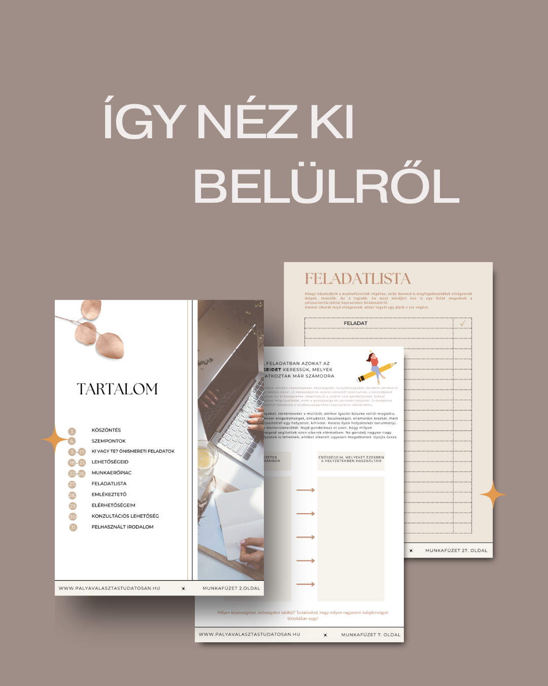 A munkafüzet 10+1 karriertervezést támogató önismereti feladatot, valamint ezeken kívül sok információt, segédanyagot, listát, átgondolandó kérdéseket, kattintható linkeket tartalmaz a tanulási lehetőségekről és a munkaerőpiacról.